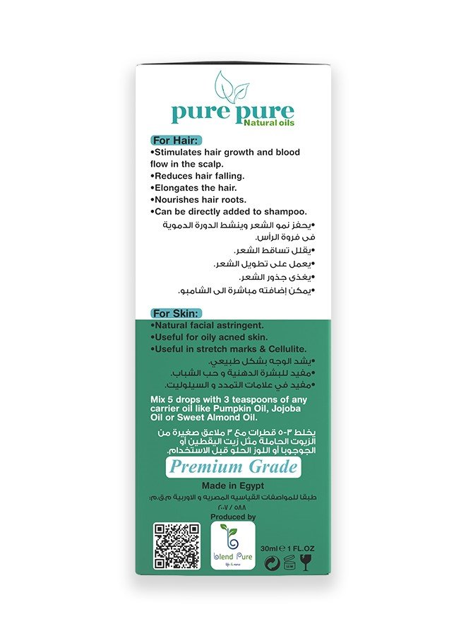 زيت إكليل الجبل او زيت الروزماري النقي من Pure Pure، المُستخلص بالتقطير البخاري من أوراق إكليل الجبل الطازجة للحفاظ على مركباته العطرية النشطة. زيت نقي 100% يُستخدم لتحفيز نمو الشعر، تنقية فروة الرأس، وتعزيز التركيز الذهني.